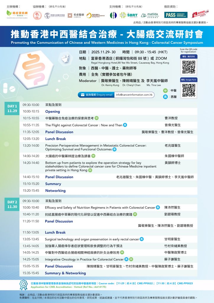 癌症資訊網慈善基金誠邀各位醫療界同仁,參加將於2025年11月29日至30日舉行的「推動香港中西醫結合治療 – 大腸癌交流研討會」。是次研討會獲香港特別行政區政府「專業服務協進支援計劃」撥款資助,旨在匯聚西醫、中醫、護士及藥劑師等專業人士,共同探討大腸癌的最新治療策略與中西醫結合的臨床實踐