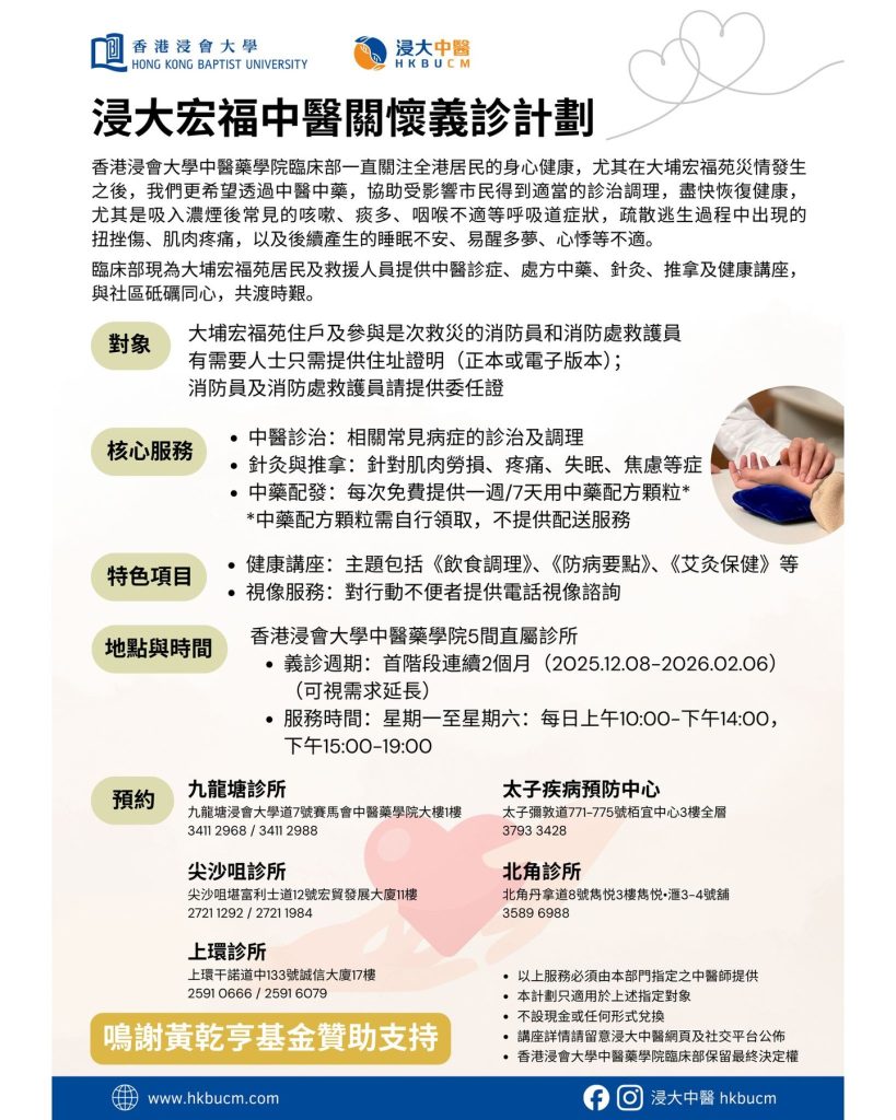 詳情:https://www.hkbucm.com/?news=浸大宏福中醫關懷義診計劃-現正接受預約&lang=hk