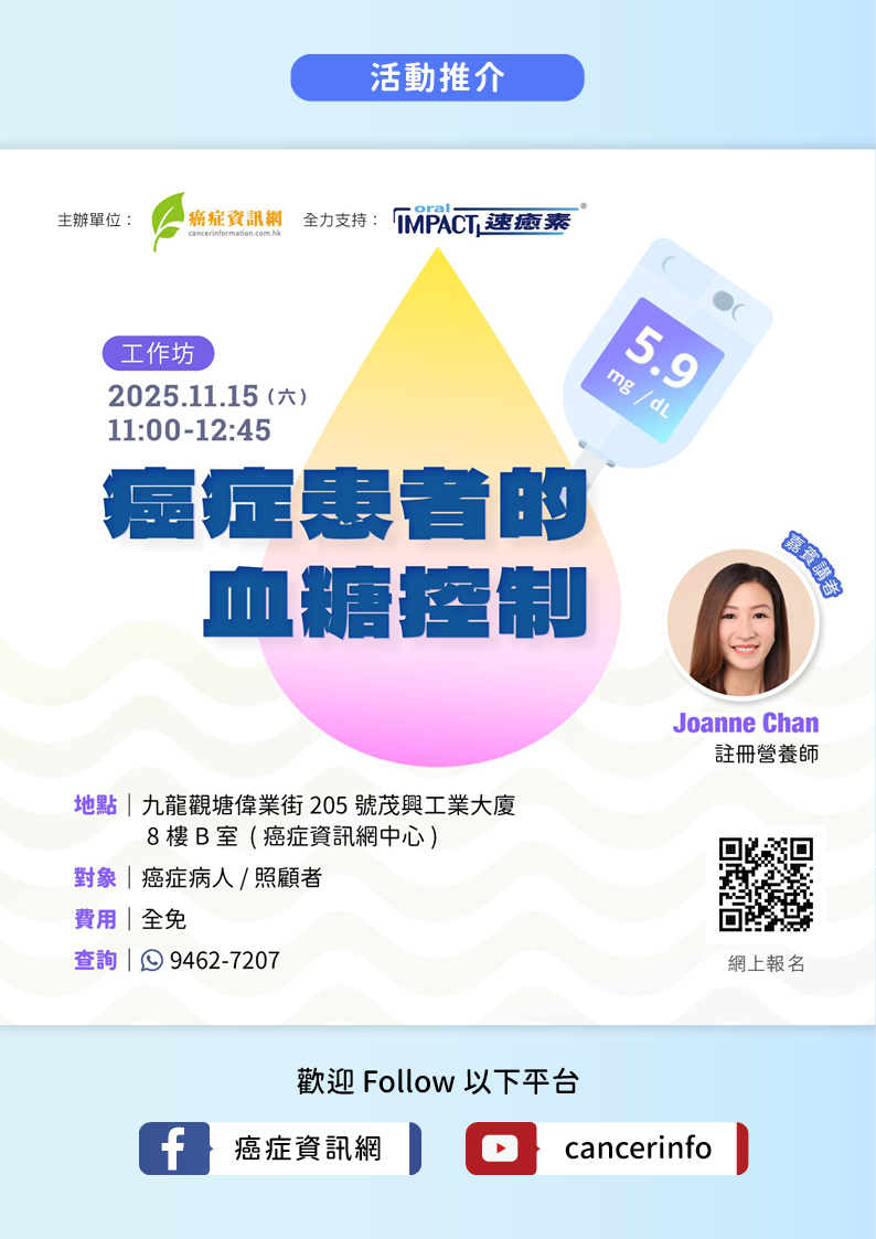 血糖控制在癌症治療中扮演關鍵角色。穩定的血糖水平不僅有助提升治療效果,還能改善生活質素,減輕疲倦、促進傷口癒合,並降低併發症風險。想了解如何透過飲食與生活習慣有效管理血糖?立即報名我們的免費工作坊!活動當日 註冊營養師 Joanne Chan 將會為你解答血糖控制上嘅疑問!