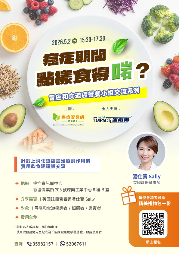 今次我地特別邀請英國註冊營養師 潘仕寶 Sally,為大家分享針對上消化道癌症治療副作用的實用飲食建議,教你點樣喺治療期間仍然食得健康、食得舒服、維持體力!今次 Sally 希望可以同大家直接交流,一問一答,俾最專業最岩嘅建議你 ! 機會難得,千奇唔好錯過呀!